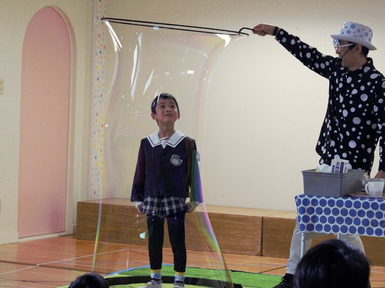 様々なシャボン玉を作り出すショーにくぎ付けの様子でした~