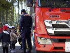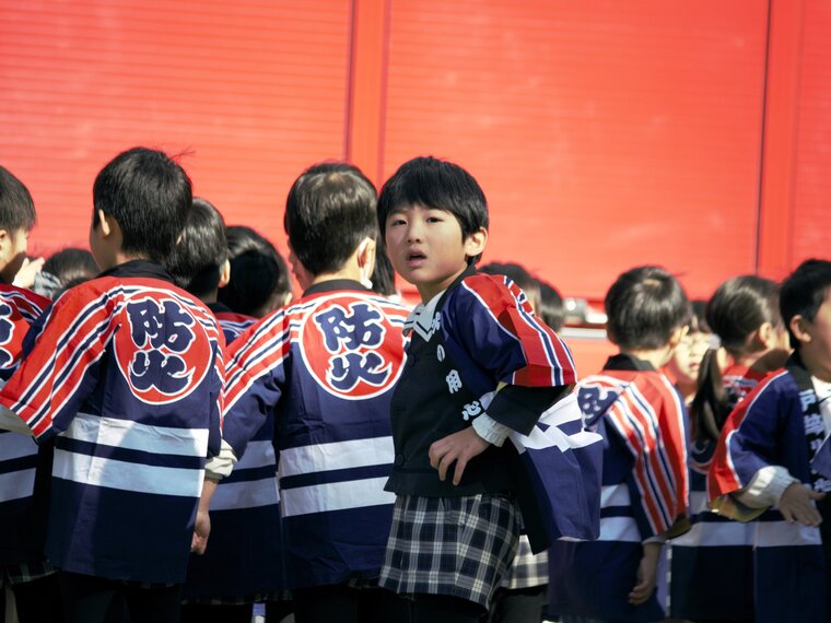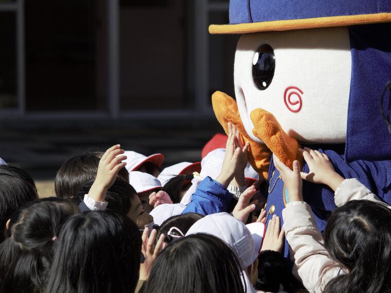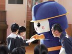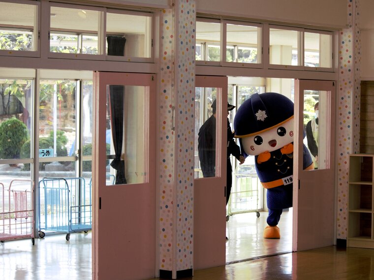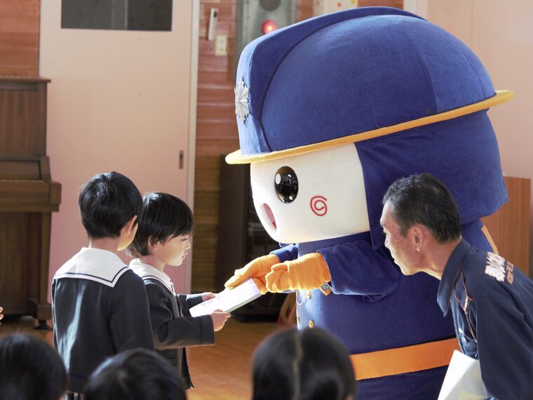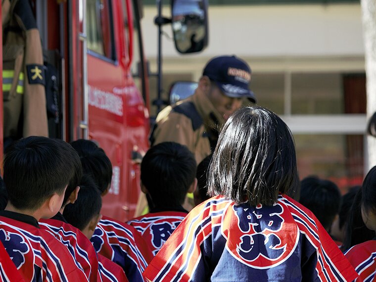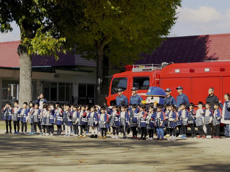 避難訓練をしっかり行った後は、火まもり君と一緒に消防車の見学です